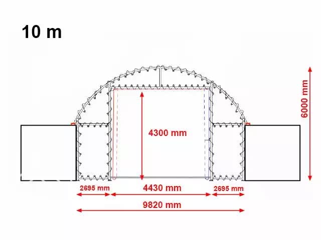 Táto predná stena so zabudovanou bránou je určená pre strechy kontajnerov so šírkou 6 m. Ponúka dodatočnú ochranu proti vetru a poveternostným vplyvom, pozostáva zo stabilného rúrkovitého oceľového rámu chráneného proti korózii a extra robustnej, ​​odliatej, ťažkej PVC plachty s hmotnosťou približne 720 g / m². Materiál PVC je odolný voči UV žiareniu, 100% vodotesný a má 9-krát vyššiu odolnosť proti roztrhnutiu ako bežné komerčné plachty z PVC. Predná stena je pripevnená napínacími lanami a má veľkú hlavnú bránu, ktorá sa dá ľahko otvoriť pomocou ťažného zariadenia. Na upevnenie na mäkkých podlahách sú v rozsahu dodávky zahrnuté pevné, úplne pozinkované plné oceľové kolíky (dlhé približne 100 cm). Výška kontajnera alebo zodpovedajúcej spodnej konštrukcie by mala byť približne 2,6 m max 2,9m sa vie natiahnuť.